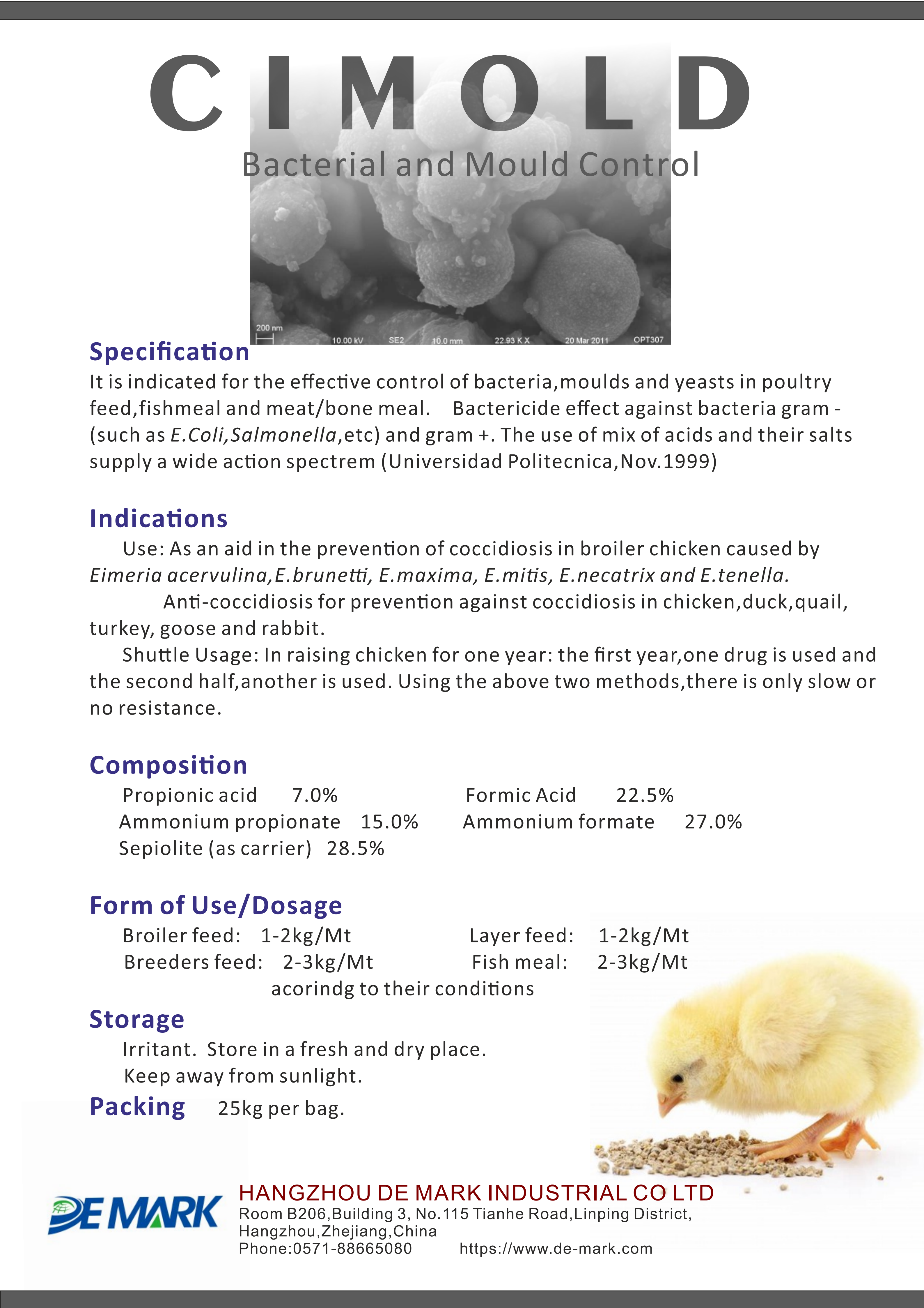It is indicated for the effective control of bacteria,moulds and yeasts in poultry feed,fishmeal and meat/bone meal. Bactericide effect against bacteria gram - (such as E.Coli,Salmonella,etc) and gram +. The use of mix of acids and their salts supply a wide acids on spectrem (Universidad Politecnica,Nov.1999)